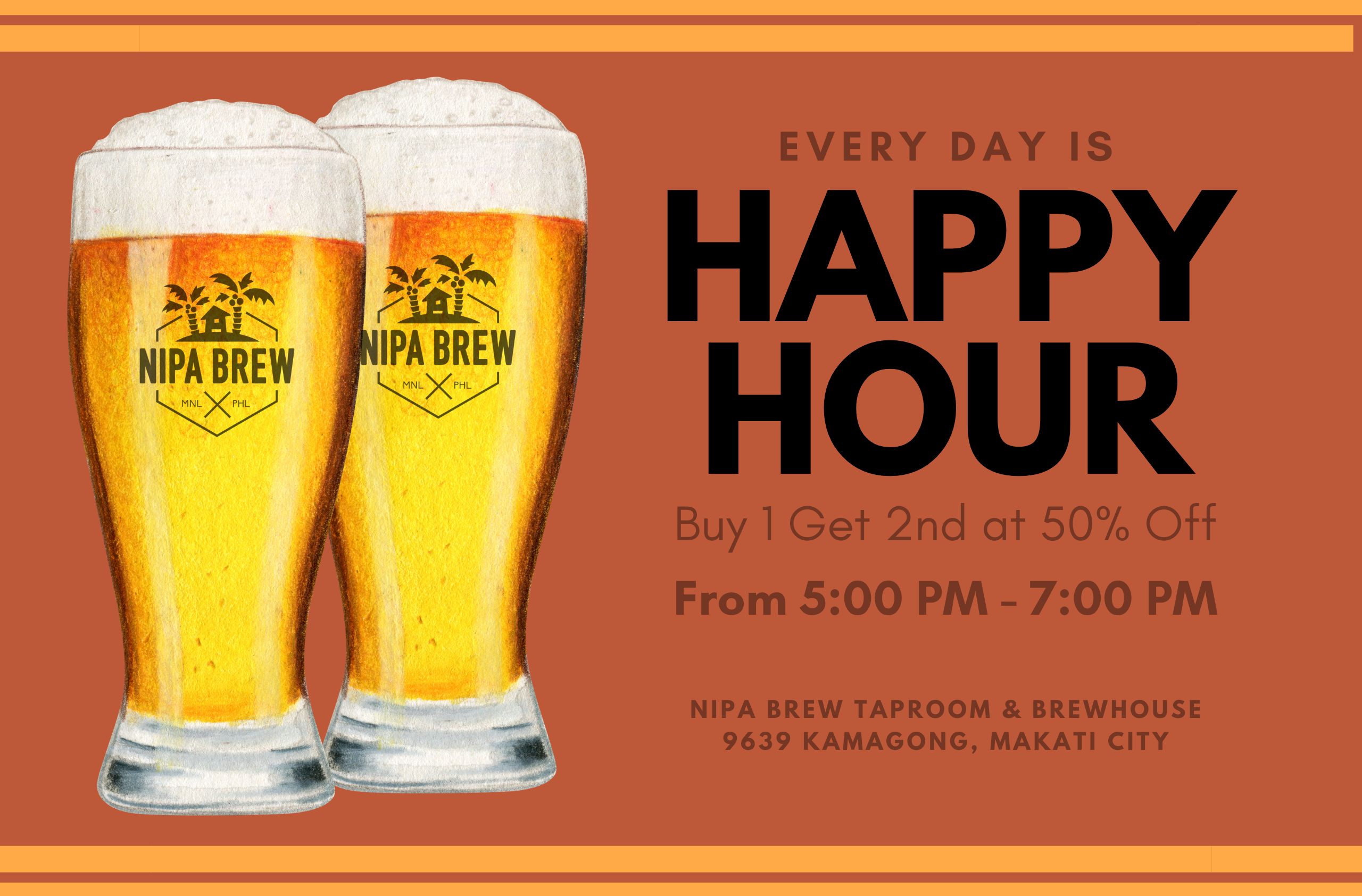At Nipa Brew, every day is Happy Hour! Buy 1 Beer Get the 2nd beer at 50% off, from 5:00 pm to 7:00 pm only. This promo is valid exclusively for Nipa Brew’s standard beers on tap.
